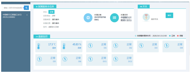 实时监控页面平台能显示设备在线状态,能显示设备各个回路的类型,监控区域,回路状态,回路的上下班状态。
