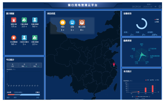 银行用电安全云平台通过采集设备的数据,能够对现场的电压、电流、温度、电弧等进行实时监测并进行数据分析,并对被保护线路的过压、过载、过流、过温、欠压、打火、缺相、设备不在线等情况进行预警,系统在发现电气火灾预警时,信息可多种途径及时通知相关单位处理,确保用电线路系统安全。